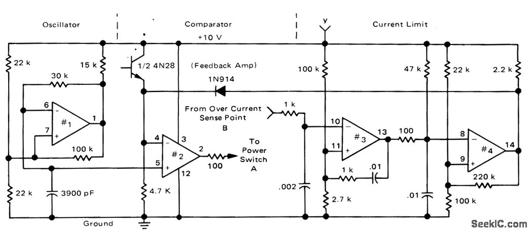 Uses all four sections of Motorola MC3302 quad comparator. First section is connected as 20-kHz oscillator that supplies sawtooth output sweeping between voltage limits set by 100K positive feedback resistor and 15-V supply. Section 2 compares sawtooth output to feedback signal, to produce variable-duty-cycle output pulse for power switch of switching regulator. Sections 3 and 4 initiate current-limiting action; section 3 senses over current and triggers section 4 connected as mono MVBR. Limiting occurs at about 4 A. When load short is removed, regulator resets automatically. Point A goes to push-pull drive for power switch of regulator, and point B goes to current-sensing resistor in output circuit of regulator. Point y goes to 10-V supply.-R. J. Bayer, A New Approach to Switching Regulators, Motorola, Phoenix, AZ, 1975, AN-719, p 7.