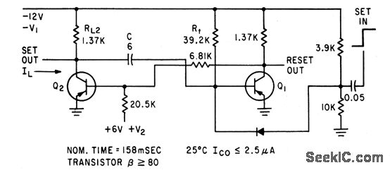 Requires bulky capacitors and large timing resistors to get accurate delay times of 1 to 300 millisec. Ideal for laboratory use, but gives problems with mass production.-D.E. Haselwood. Monostable Multivibrators with Stable Delay Times. Electronics.34:49,p64-65