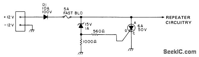 Developed to protect portable repeaters from reverse or excessive voltage when operating on emergency power supply. Zener voltage rating determines maximum voltage that can reach repeater. Diode prevents damage by incorrect polarity. Use fast-blowing fuse.-Circuits, 73Magazine, April 1977, p 164.