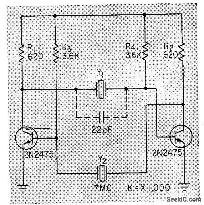 Use of 7-Mc crystal in place of feedback capacitors in conventional mvbr improves stability and waveform while still permitting operation down to 750 kc. Circuit also operates with one crystal; variable 7-47 pf capacitor in noncrystal-controlled side permits varying pulse width on this side over wide range.-H. R. Newhoff, Crystal-Controlled Multivibrator has Better Stability, Electronics, 36:15, p 60-61.