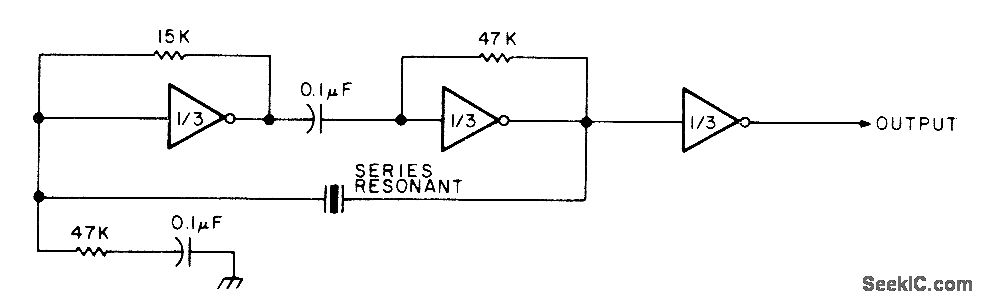 Uses all three sections of CD4049 triple inverter.with series-resonant crystal connection.supply can be in range of 3 to 15V. Serves as compact Iow-power portable RF oscillator having low battery drain.-W. J. Prudhomme, CMOS Oscillators. 73 Magazine. July 1977. p 60-63.
