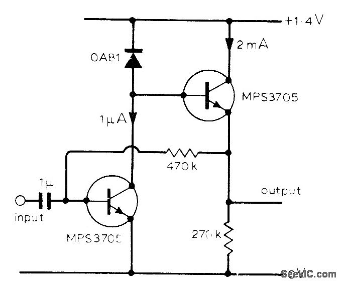 Reverse-biased germanium diode serves as voltage-independent current source for loading silicon transistors in linear amplifier having voltage gain of 50 and -3 dB bandwidth of t6-4000 Hz. In addition to low cost, circuit design permits reliable operation of reliable micro-power circuits over wide temperature range at optimum current drain. -M. G. Baker, Low-Cur-rent Source, Wireless World, April 1976, p 61.