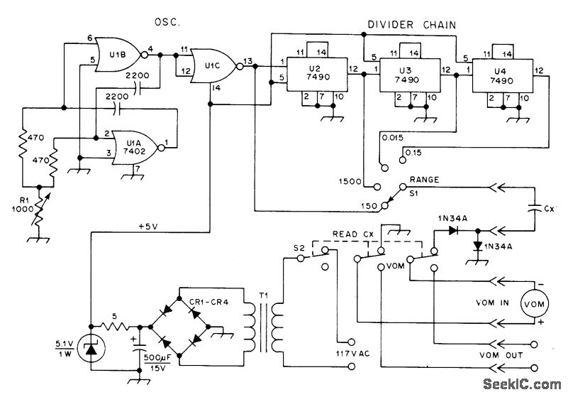 TTL-derived square-wave gen-erator U1 charges unknown capacitor CX to about 3.5 V at 285 kHz when using 150-μA scale of Heath MM-1 volt-ohm-milliammeter, to give 150-pF full-scale range. Larger values of capacitance are read by decreasing frequency with 7490 decade dividers. Use Mallory PTC401 for CR1-CR4. T1 is 6.3-VAC filament transformer. S2 restores normal VOM functions. Article gives design equations.-K. H. Cavcey, Read Capacitance with Your VOM,QST,Dec. 1975, p 36-37.