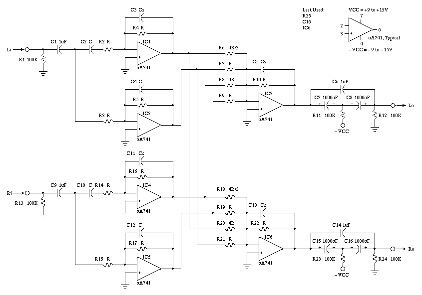 The schematic (which is available in larger size jpeg, PostScript, PDF, or xfig, formats,) is a prototype circuit that implements the required frequency and crossfeed contouring. As a development objective, the low and high frequency contouring and crossfed control elements must not interact-they must be independently adjustable.