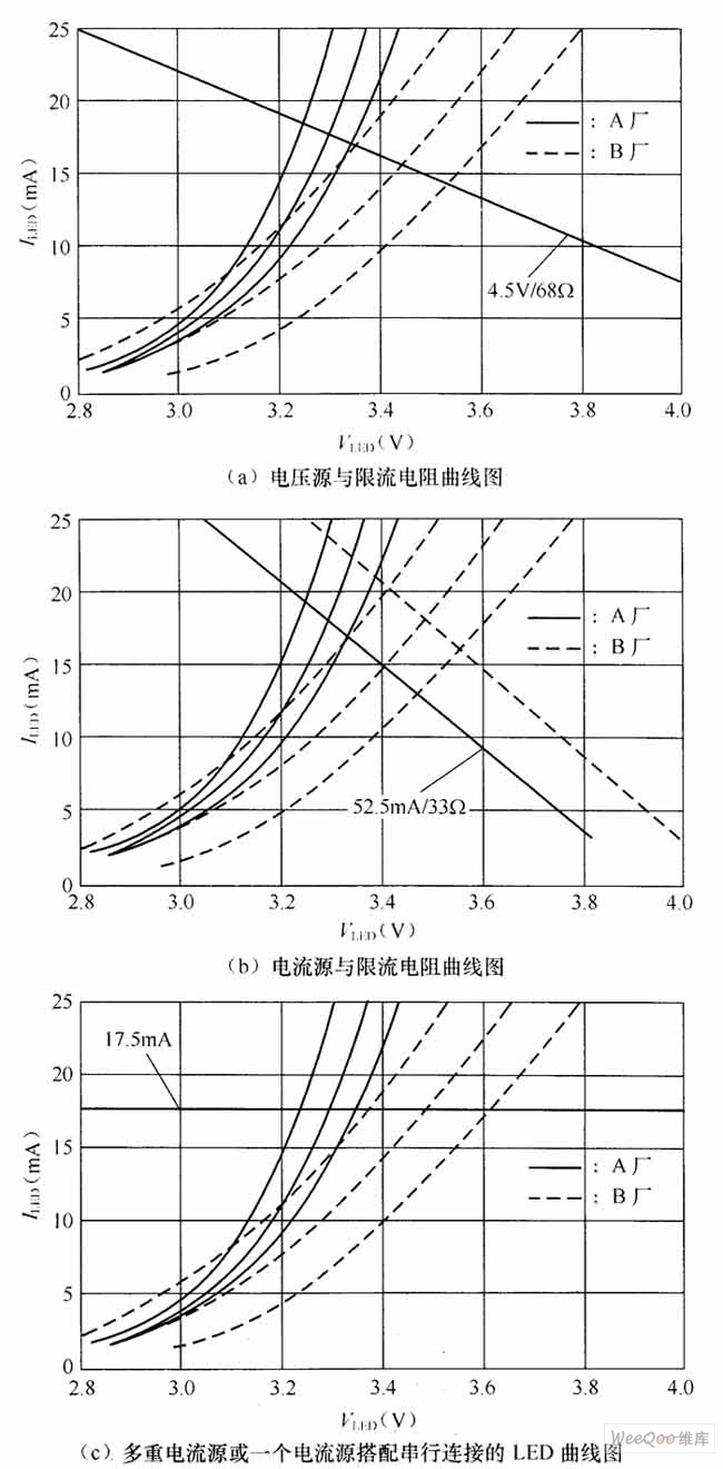 Figure 1 is 4 kinds of common white LED drive circuit and the white LED positive voltage differences will make different impacts to current stable accuracy because different stabilized voltage lines are used. The firgure 2 are six white LED(They are chosen from two manufactuers) positive electric current and forward voltage characteristic curve and , the output voltage stabilizer load curve and lies at the intersection of voltage characteristic curve is the point.