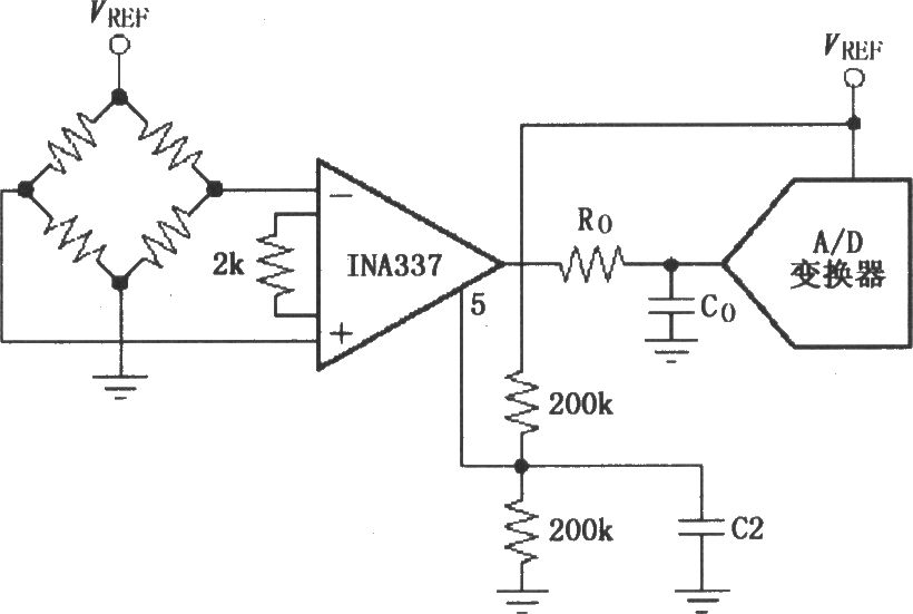 As shown by INA337 constitute the output of the reference potential for VREF / 2 circuits. When unbalanced bridge, the bridge output voltage by the output after INA337 magnified 100 times, after filter composed of Ro and Co filter out noise, and sent to the A/D converter converts analog signals to digital signals. In 5 feet with two 200 k Ω INA337 resistance partial pressure, VREF / 2 potential, potential to VREF / 2 to 5 feet. Output voltage is 5 feet for reference potential, so the output potential becomes relatively to VREF / 2 for reference. G = 2 (200 k Ω ∥ Ω) 200 k / 2 k Ω = 100.
