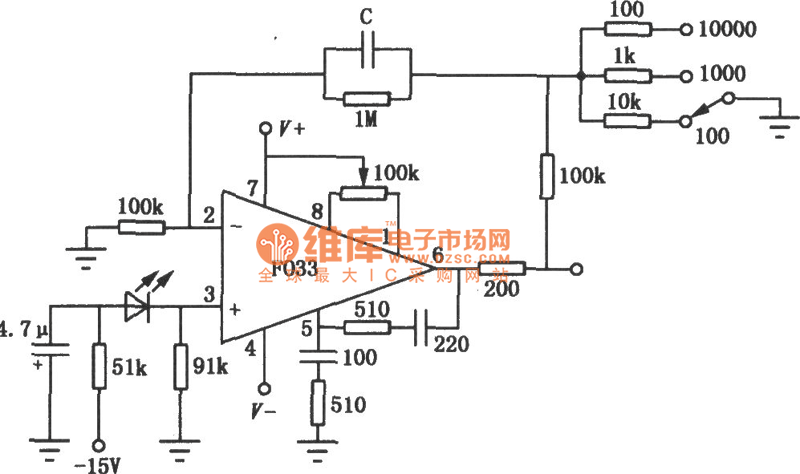 Sensitive signal amplification circuitis used toamplify photodiode or phototransistor optoelectronic devices such as electrical signals. When the incident light illumination changes, the optical devicecan generate certain current, because the signal is very weak sensitive, so it’s better to use a operational amplifier in very low input bias current. In order to eliminate oscillations, it adds a small capacitor C (pF orders of magnitude) in the feedback circuit, but the value of C affects the bandwidth of the amplifier. The DC gain of the circuit is l00, 1000,10000, you can select switch corresponding to 10kΩ, 1kΩ, 100Ω resistors to ground, the circuit of the resistor accuracy must be better than ± 1%. Photocell uses FPT102 or FPT100.