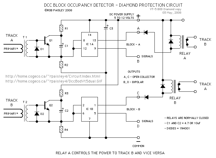 The circuit in the first schematic is for a diamond protection circuit that used two transformer type DCC Block Occupancy Detectors.