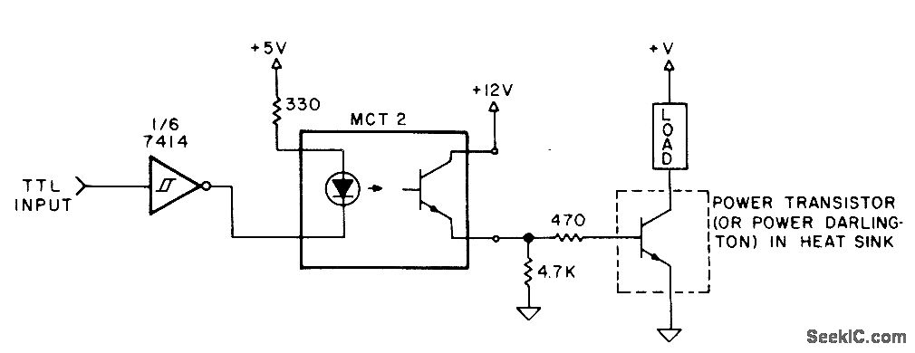 Output of microprocessor drives LED of photocoupler through one section of 7414 hex Sch mitt-trigger-input inverter. Phototransistor switches power transistor or power Darlington on and off for control of direct current through load. With transistor having current gain of 30 and 20-mAcontrol cur-rent, load current can be 500 mA. With power Darlington having higher current gain, load can be several amperes. Since power de-vice is either off or saturated, heatsink can be small.-M. Boyd, Interfacing Tips, Kilobaud, Feb. 1978, p 72-74.