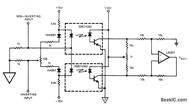 Two isolators operating like push-pull amplifier minimize harmonic generation. When input signal is applied, upward change of incremental gain in one isolator is balanced by downward change in other to give harmonic cancellation. Circuit gain is about unity. Bandwidth is 2 MHz for signal below 2 V p-p. Input signals of either polarity may be applied at either inverting or noninverting input.-H. Sorensen, Opto-Isolator Developments Are Making Your Design Chores Simpler, EDN Magazine, Dec. 20, 1973, p 36-44.