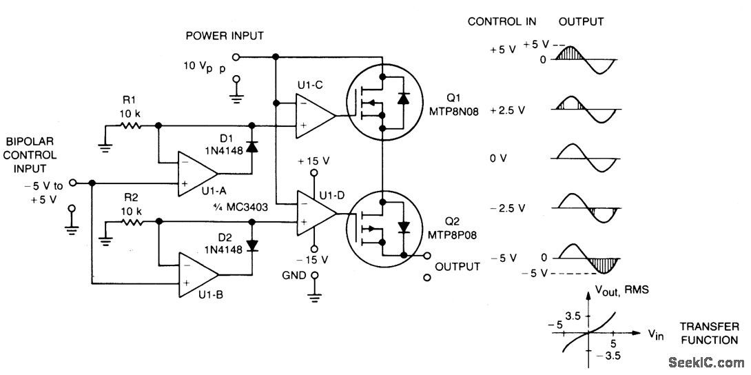 This circuit accepts bipolar control inputs of ±5 V and provides a phase-chopped output to a dc load (such as a servo motor) of the same polarity as the input. The rms voltage of the output is closely proportional to the control input voltage.