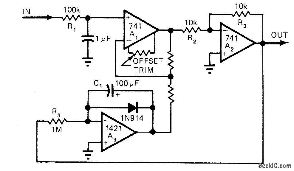 Analog derivative circuit forces voltage across C1 to follow slowly changing input signal. Current required to keep capacitor voltage equal to signal volt-age is proportional to rate of change of signal voltage. RCA 3033 FET-input opamp will work equally as well as Teledyne Philbrick 1421 shown. Careful selection of values for Rπ and C1 will set rate limit that will reject spikes.-R. E. Bober, This Derivative Circuit Handles Slowly Varying Signals, EDN Magazine, Jan. 20, 1976, p82.