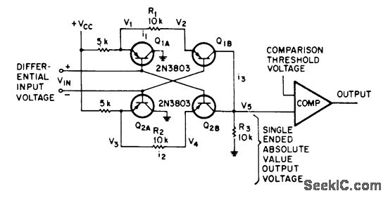 Used in comparing differential level to threshold level with good common-mode rejection. Input impedance is maintained high to avoid over loading differential input. Output voltage re-mains positive when input polarity is re-versed.-R. L. Wiker, Differential to Absolute Value Converter, EEE Magazine, Jan. 1971, p 65.
