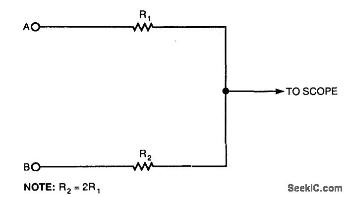 Using this simple resistor circuit, you can trick your oscilloscope into displaying two logic signals on one channel. If you select R2 to be twice R1, the scope trace will show one of four distinct analog levels for each possible combination of the states of inputs A and B.