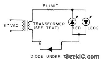 Requires only one resistor, two LEDs, and any small power transformer providing 3 to 25 VAC. If diode under test is open, neither LED lights, lf diode is shorted, LED1 lights on one half-cycle and LED2 on other half-cycle, so both appear lit continuously. If diode is good, LED1 will light if anode of diode is toward transformer, and LED2 will light for other polarity of diode. Choose resistor to limit current through LEDs to about 10 mA.-M. D. Kitchens, Ultra Simple Diode Checker, 73 Magazine, Oct. 1977, p 44-46.