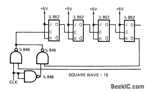 Input clock is altemately inverted and noninverted by gates operating in coniunction with 4 bits of storage using 852 JK flip-flops, to give square-wave output at 1/15 of clock frequency.-C. W. Hardy, Reader Responds to Odd Modulo Divider in July 1st EDN, EDN Magazine, Oct, 1, 1972, p 50.
