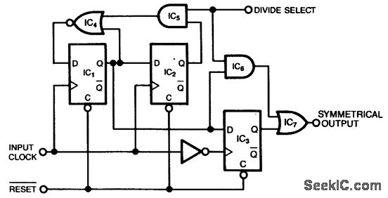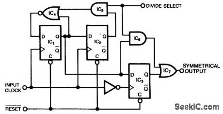 This circuit produces a symmetrical waveform when dividing by either 2 or 3. The Divide Select input controls the division factor. When Divide Select is high, flip-flops IC1 and IC2, along with associated gates, form the classical divide-by-3 circuit.