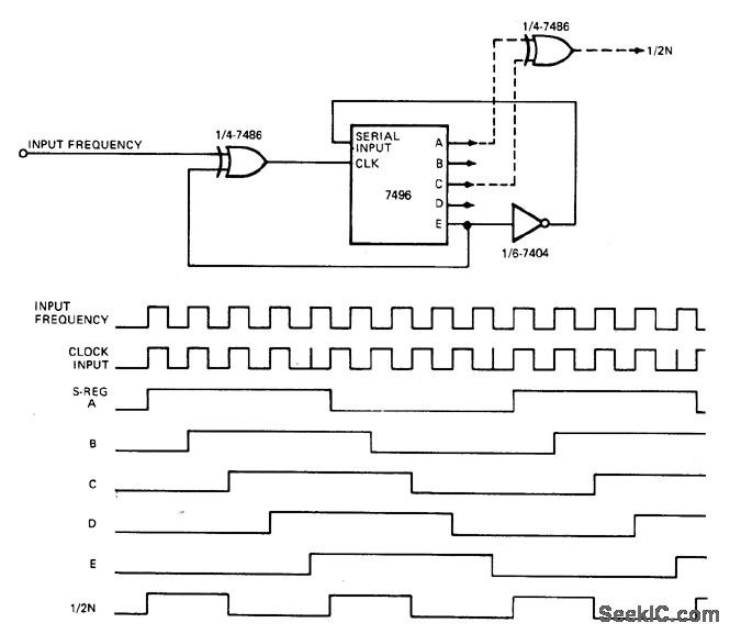 Uses 7496 as 5-bit shift register,7486 as EXCLUSIVE-OR gate,and 7404 as inverter to give division of square-, aveinput frequency by 9 while main-taining 50% duty cycle at output Article covorsconnection changes needed for other divisionratios,With 8-bit shiftregister,circuit, divideby as much as 15,Addition of,486 EXCLUSIVE-OR gate across any outputs,as shown by dashed lines,makes effective output har that of basic TTL circuit,-J,N,Hobbs,Jr.,Divide-by-N Uses Shift Register,EDN Magazine,Oct 5,1976,p 108.
