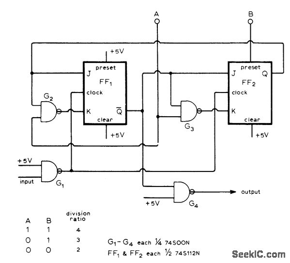 Division ratio is controlled externally by making control terminals A and B high (1) or low (0), as given in table. Developed for use in receiver requiring local oscillator covering 10 to 30 MHz. Counter simplifies tuner design.-C. Attenborough, Fast Modulo-3 Counter, Wireless World, Aug. 1976,p 52.