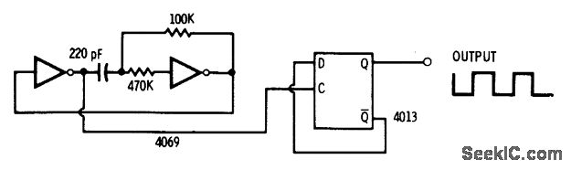 4013 dual D flip-flop is used as binary divider at output of astable MVBR to give 50/50 symmetry for output frequency half that of MVBR.-D. Lancaster, CMOS Cookbook, Howard VV. Sams, Indianapolis, IN, 1977, p 232-234.