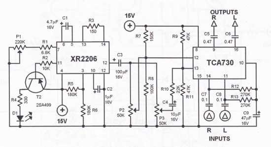 This tremolo effect circuit uses the XR2206 and the TCA730 IC which is designed as an electronic balance and volume regulator with frequency correction. The circuit is usefull for stereo channels and it also has the ability to simulate the Lesley effect aka rotating loudspeaker effect. How does the tremolo effect circuit works