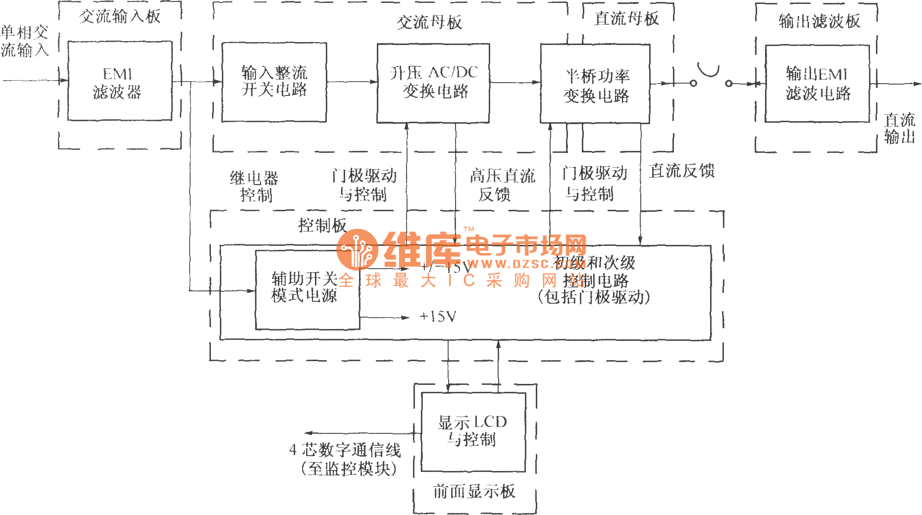 Compare to DMA10 type rectification module, the selection of working frequency and the topological structure of power inversion of DMA12 type rectification module is the same. The difference is, DMA12 using the compensation mode of single phase active boost power factor and natural cooling, and using the technique of non loss absorption. The diagram is its function diagram. The capacity of DMA12 type rectification module’s 48V power-supply system is 50A. The canonical system now is DUM23 series integrated power supply system. The technical target of 48V/50A rectification module is shown in the following table: