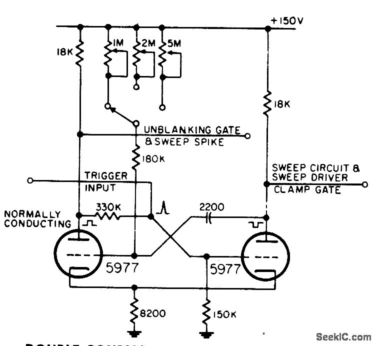 Uses both cathode and plate-to-grid coupling, with gate length changed by switching of potentiometers. Used in radar to provide gate during which display sweep is generated, along with gates for waveforms that must be coincident with display sweep.-NBS, Handbook Preferred Circuits Navy Aeronautical Electronic Equipment, Vol. 1, Electron Tube Circuits, 1963, p N10-3.