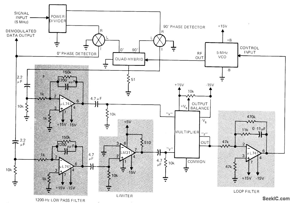 Differential phase-shift keyed double-sideband suppressed-carrier signal is demodulated by reinsertion of missing carrier, using synchronous or coherent detection. Receiver input signal is multiplexed by locally generated carrier, accurately controlled in frequency and phase. This is followed by low-pass filtering. Demodulation at output is by frequency/phase controlled loop that automatically locks local oscillator in frequency and phase to received vestige of carrier. This extracts phase information from modulated signal. Power divider is BF Associates H22, quad hybrid is Merrimac Research QHT-2, 0°and 90° phase detectors are Relcom M6A, and multiplier is Analog Devices 4281. Article covers theory and operation of circuit in detail.-R. Hennick, Demodulate DPSK Signals Coherently Using a Costas Phase-Lock Loop, EDN Magazine, July 1, 1972, p 44-47.