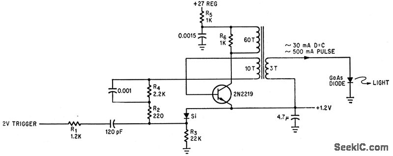 When blocking oscillator is triggered, its output controls flashes from light-emitting diode. Triple-winding transformer gives maximum output for minimum power-supply drain.-C. H. Moulton, Light Pulse System Shrinks High-Voltage Protection Device, Electronics, 38:11, p 71-75.