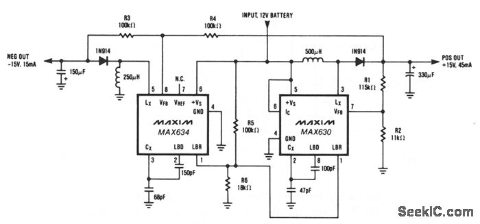 A MAX634 inverting regulator is combined with a MAX630 to provide a dual tracking ±5 output from a 12-V battery. The reference for the -15 V output is derived from the positive output via R3 and R4. Both regulators are set to maximize output power at low battery voltages by reducing the oscillator frequency, via LBR, when VBATT falls to 8.5V.