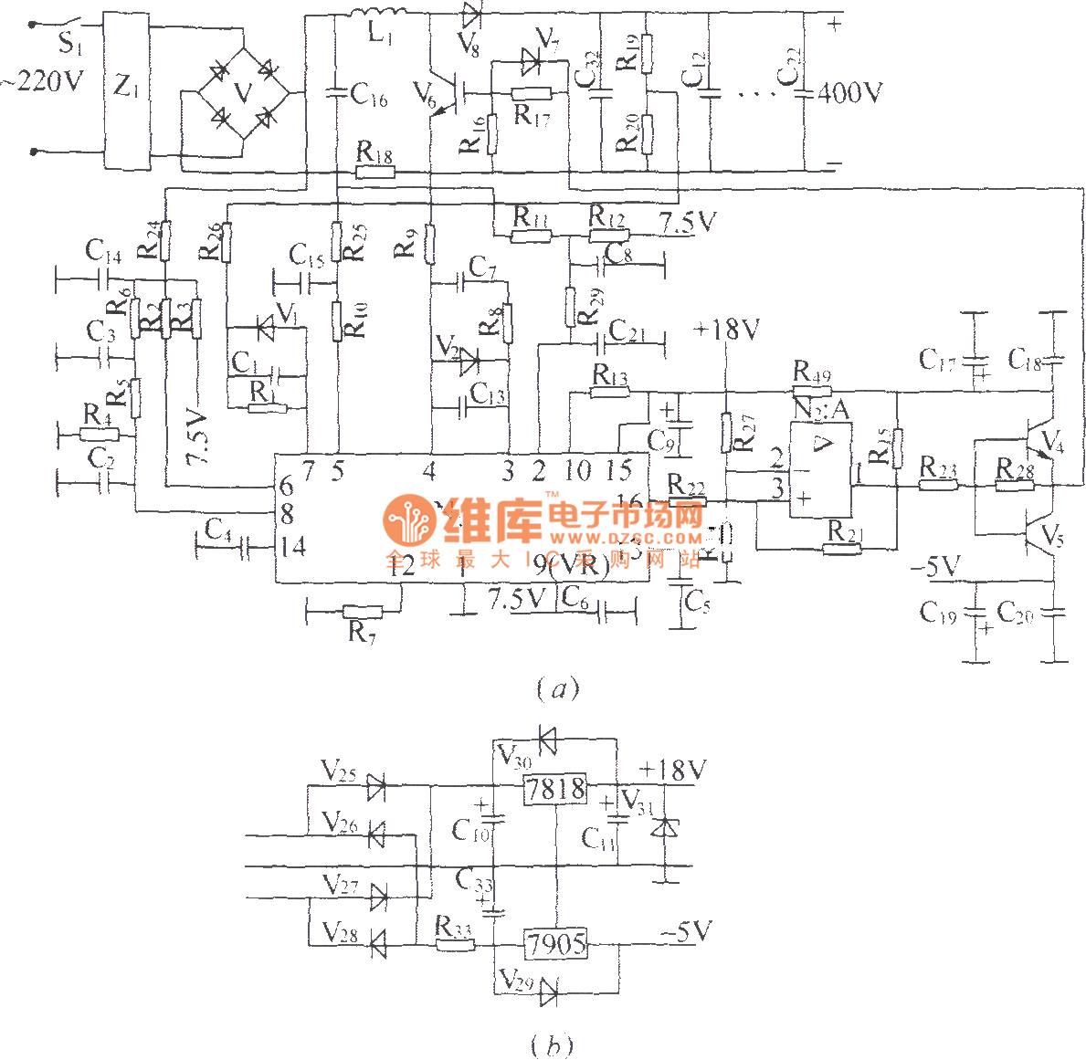 In the diagram, (a) is compensation circuit, (b) is auxiliary power supply. It mainly consists of N1, power factor calibration control module and some support circuits. N1 internal circuit consists of saw-tooth wave generator, pulse width modulator and multiple comparator circuit and so on. The frequency of saw-tooth wave generator is determined by out-connected capacitor and resistor. This machine makes the frequency of its output pulse work at 50 kHz, and the width of output pulse is determined by the error voltage after a general comparison treatment. It has three sampling and comparison circuits. V6 is actually an integrated chip containing VMOS tube,enhance diode and rectifier bridge.