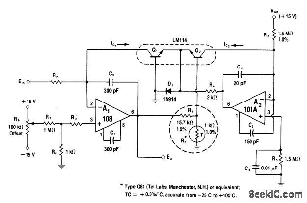 Circuit generates log ratio of currents Ic1, and Ic2, with accuracy within 3% from 10 nA to 1 mA (100dB range) when Ic2 is fixed at 10-μA reference value. Accuracy increases to 1% for current inputs between 40 nA and 400 μA (80 dB). A2 supplies constant reference current to Q2.Q1 is operated as transdiode withQ2 providing temperature compensation of offset voltage.-W. G. Jung, IC Op-Amp Cookbook, Howard W. Sams, Indianapolis, IN, 1974 ,p 213-214.