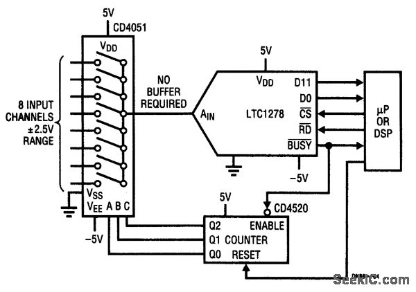 The high input impedance of the LTC1278 allows multiplexing without abuffer amplifier. Both sin-gle channel and multiplexed high-speed data acquisition systems benefit from the LTC1278/LTC1279's dynamic conversion performance. The 1.6-μs and 1.4-μs conversion and 200-ns and 180-ns S/H acquisition times enable the LTC1278/LTC1279 to convert a 500 ksps and 600 ksps, respectively. The figure shows a 500-ksps 8-channel data acquisition system. The LTC1278's high input impedance eliminates the need for a buffer amplifier between the multiplexer's output and the Adc's input.