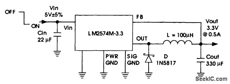 A National Semiconductor LM2574 is used to derive 3.3 V at 0.5 A from a 5-V logic bus. The duty cycle is: VD = diode drop (0.39) VIND = inductor dc drop VSAT = saturation voltage of LM2574 (0.9 V typical) This circuit should be useful to derive 3.3 V for logic devices from existing +5-V buses.