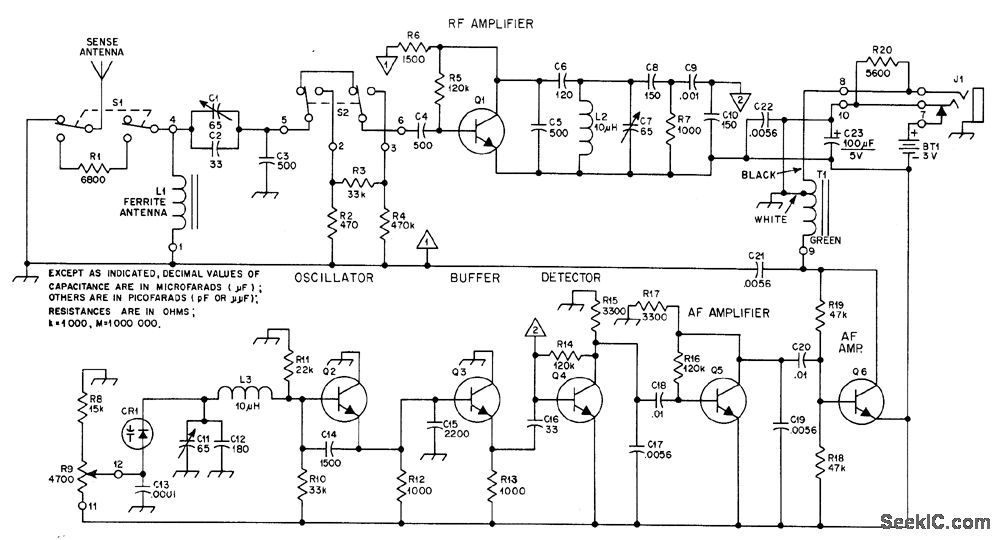 Portabl e receiver with directional ferrod antenna and ver-tical sense antenna was developed for radio foxhunting at 1975 Bov Scout World Jamboree in Norway, in competitions for locating four low-power crystal-controlled transmitters hid-den along 4-km course. Varactor-tuned oscillator provides 20-kHz tuning range with R9, ade-quate for the frequency used-3.566, 3.585, 3.635, or 3680 MHz. T1 is subminiature auto-transformer with 8-ohm and 2000-ohm sec-tions, for 8-ohm headphones. For high-imped-ance headphones, connect headphone jack J1 to lug 9 of T1. ON/OFF switch is not needed, L1 is 22 turns No. 28 enamel wound over two 10×95 mm ferrite rodstaped together. 01-06 are NPN high-frequency small-signal transistors.-N. K. Holter, Radio Foxhunting in Europe, QST, Nov. 1976, p 43-46.