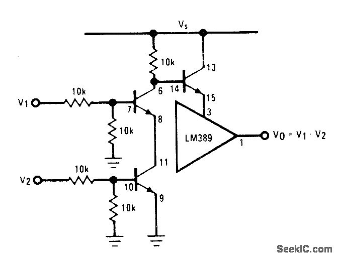 Connection shown for National LM389 combination of three transistors with opamp gives standard AND circuit for controlling muting transistor in audio sys tem. Shorting pin 12 of opamp to ground gives NAND Iogic.- Audio Handbook, National Semiconductor, Santa Clara, CA, 1977, p 4-33-4-37.