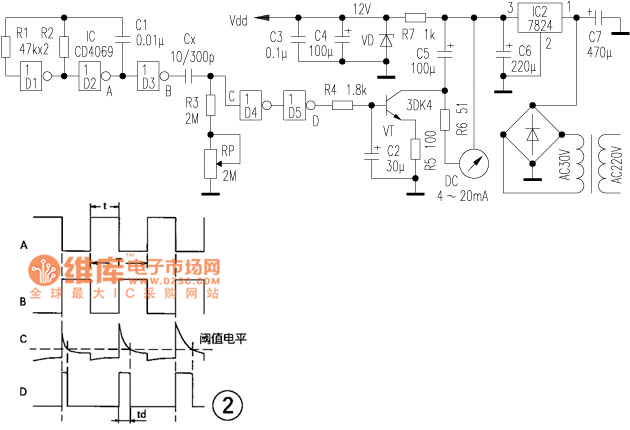 Circuit principle: the multivibrator signal is led out by D2 output. When D2 output is high, the monostable circuit is in a steady state, and D3 output, D4 input, D5 output are low voltage. When D2 output is low, the monostable circuit enters into the temporary stable state. When D3 outputs high voltage, it charges Cx through R3 and RP. Meanwhile, D5 outputs a high level into the U-I output stage, and D4 input voltage decreases exponentially with time. When the voltage is lower than D4 threshold level, the output jumps high, and then jump into a low voltage after being inverted by D5. When the square wave D2 outputted jumps high, Cx is then discharging through R3 and RP until D2 becomes high voltage, which completed a one-shot cycle. Waveform in each point is shown in Figure 2. The output pulse width td is proportional to Cx. The voltage, smoothed by R4 and C2, sent to VT base, is amplified and converted into 4 ~ 20mA DC uniform signal.