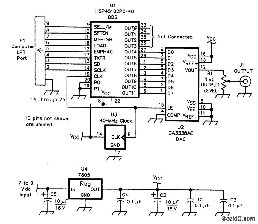 The DDS chip (U1) generates a data stream that is converted by D/A converter U2 into a sine wave. U1 is programmed via the input from P1, from the LPT port of an IBM PC. The system uses a 40-MHz TTL output clock module.