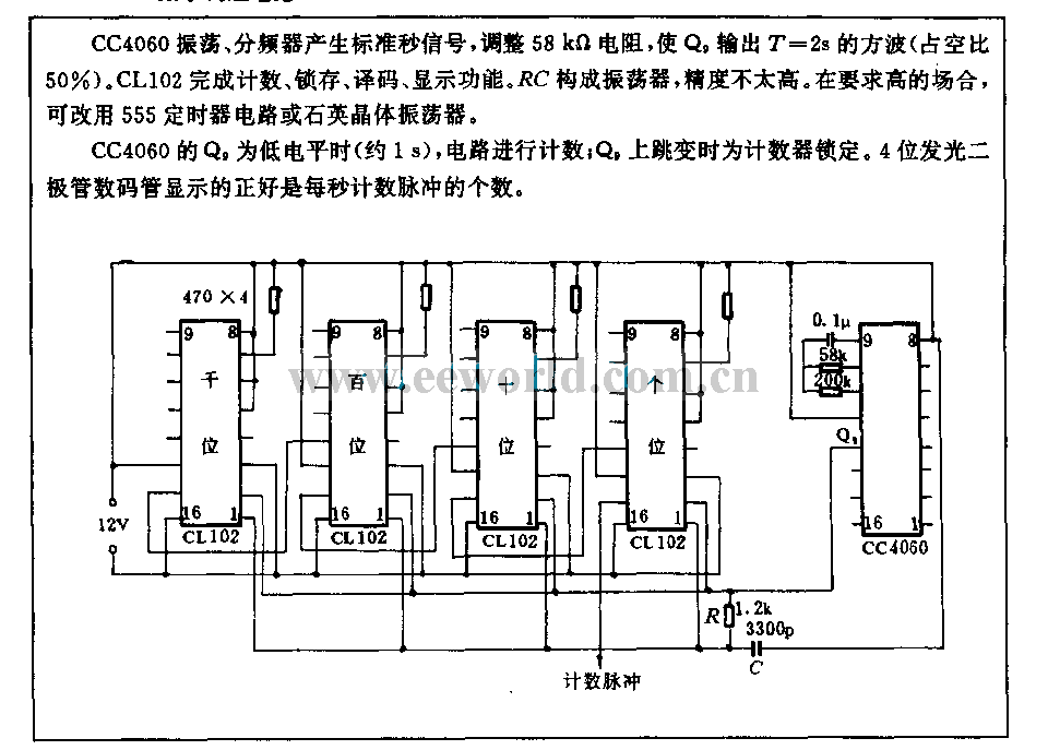 CC4060 oscillation, frequency divider produces standard second signal, to adjust 58kΩ resistance, to make Q9 outputs T=2s square wave(duty cycle is 50%). CL102 completes counting, latch, decoding, display function. RC forms oscillator, but the precision is not high. In demanding occasion, we can use 555 timer circuit or quartz crystal oscillator.