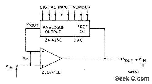 If a DAC is operated in the feedback loop of an operational amplifier,then the amplifiergain is inversely proportional to the input digital number or code to the DAC,The version giving scaling inversely proportional to posltive voltage is shown.