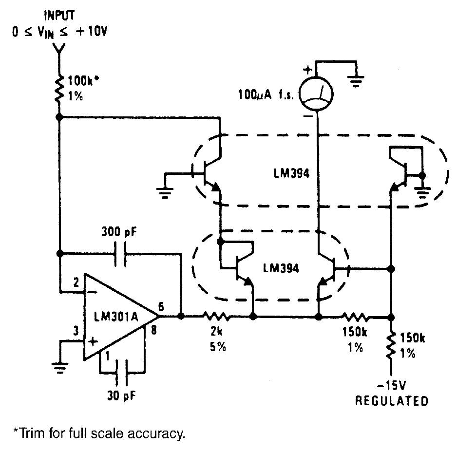 The circuit shown will square the input signal and deliver the result as an output current.Full-scale input is 10V,but this can be changed simply by changing the value of the 100-kQ input resis-tor.As in the square root Gircuit, the -15-V supply is used as the reference. In this case, however, a 1% shift in supply voltage produces a 1% shift in the output signal.The 150-kQ resistor across the base-emitter of 1/2LM394 provides slight temperature compensation of the reference current from the -15-V supply.For improved accuracy at low input signal levels,the offset voltage of the LM301A should be zeroed out,and a 100-kQ resistor should be inserted in the positive input to provide input to provide optimum dc balance.