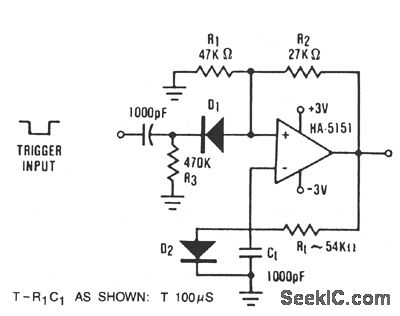 The circuit illustrates the usefulness of the HA-5151 as a battery-powered monostable. In this cir-cuit, the ratio is set to.632, which allows the time constant equation to be reduced to:T = RtCtD2 is used to force the output to a defined state by clamping the negative input at +0.6 V. Trigger-ing is set by C1, R3, and D2. An applied trigger pulls the positive input below the clamp voltage, +0.6 V, which causes the output to change state. This state is held because the negative input cannot follow the change because of Rt· Ct. This particu-lar circuit has an output pulse width set at approxi-mately 100 μs. Use of potentiometers for Rt and variable capacitors for Ct will allow for a wide variation in T.