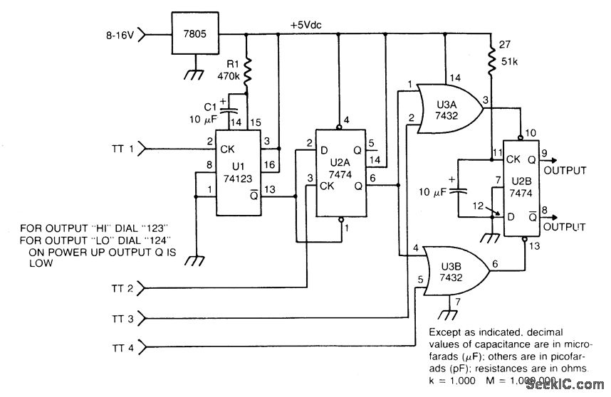 The circuit takes active low inputs from a Touch Tone decoder and reacts to a proper sequence of digits. The proper sequence is determined by which Touch Tone digits the user connects to the sequence decoder inputs TT1, TT2, TT3, and TT4.