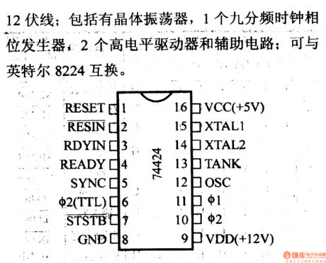 It is used to drive all 8080A microprocessors and 12V lines; it includes crystal oscillator, a nine-frequency clock phase generator, 2 high-level driver and auxiliary circuit; it can exchange with the Intel 8224.