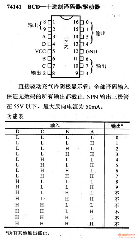 It can drive inflated cold-cathode display tube directly; all decoding input could ensure that all outputs of invalid code are off; the maximum reverse current of NPN output transistor is 50mA whenunder 55V.