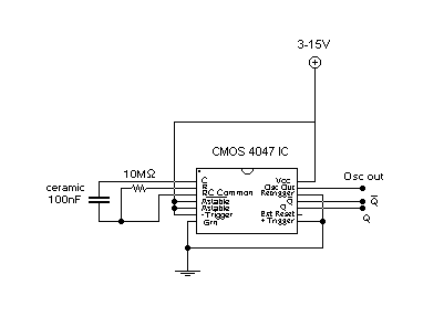 This circuit provides a digital square wave that can be viewed directly or used to drive other circuits. It used the CMOS 4047 Low-Power Monostable/Astable Multivibrator. As used in Tom Duncan's Adventures with Digital Electronic's Book, to drive CMOS Decade of 4-bit binary counters.
