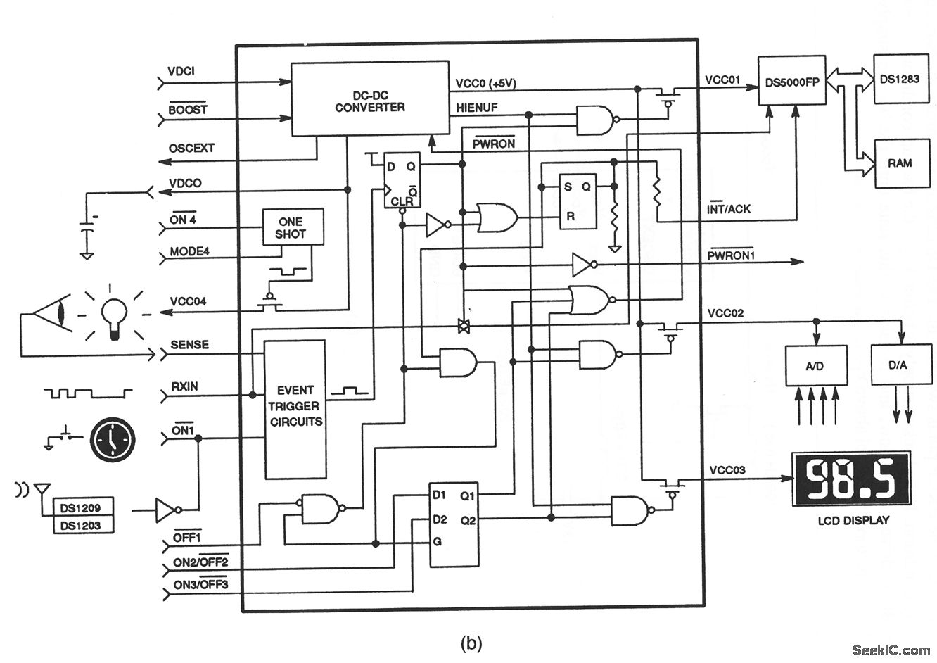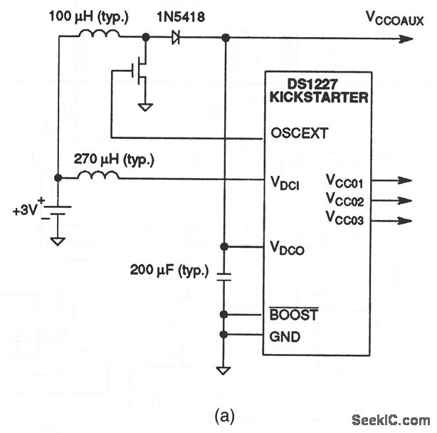 This circuit shows a DS1227 kickstarter chip connected to provide an auxiliary boost supply for digital systems. The DS1227 supplies 5 V on demand from either a 3- or 6-V battery input. The primary 5-V outputs, typically tied to a microcontroller VCC pin, is kickstarted on in response to any one of several possible momentary, external signal transitions. Examples of such signals include a clock/calendar alarm from a watchdog timer (Fig. 6-51), or an incoming asynchronous serial-data word from a host PC via a line-powered transceiver (Fig. 6-60), or a simple pushbutton switch. Figure 6-45B shows some typical kickstarter interconnections. Dallas Semiconductors, Product Data Book, 1992/1993, p. 10-17, 10-21.