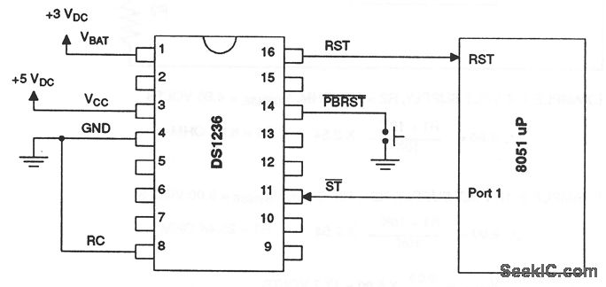 This circuit shows a DS1236 that is used to monitor and control the power-supply and software execution of a processor-based system, and to provide a pushbutton reset. When an out-of-tolerance condition occurs (when VCC is below 4.5 V for 10% operation, or below 4.75 V for 5% operation), the RST and RST outputs are driven to the active state. On power-up, RST and RST are held active for a minimum of 25 ms (100 ms typical) after 4.5 V (or 4.75 V) is reached to allow the power supply and processor to stabilize. The pushbutton input PBRST is debounced and timed so that reset signals are driven to the active state for 25 ms minimum. The watchdog-timer function forces RST and RST to the active state (shutting down the processor) when the ST input is not stimulated for a predetermined time period (because of some failure in software execution). The watchdog time period is 400-ms typical (600-ms maximum). The ST input can be taken from address, data, and/or control signals. When the processing is executing software, these signals are present, and cause the watchdog to be reset prior to time-out. Dallas Semiconductors, Product Data Book, 1992/1993, p. 10-73.