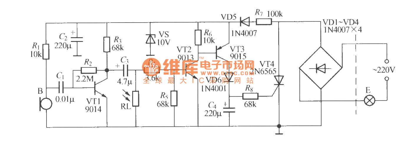 Features: during the day, lights are automatically blocked off; in the evening, as long as someone on the stairs, the lights are lit and turned off in tens of seconds delay time. Circuit uses the two-wire system connection, and the switch only has two outside terminals, which can replace the ordinary switch without having to change the existing lighting circuit. In the figure, RL can select MG44, MG45 photosensitive resistors with great difference between light resistance and dark resistance; B should use small electret condenser microphone with higher sensitivity, such as CRZ2-113F type.