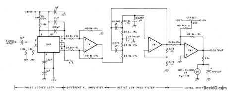 Devel oped as part of system using satellitefor relaying electrocardiograms and other medical data having bandwidth of 0.5 to 50 Hz. Audio signal serving as source of FM is applied to voltage-controlled 1-kHz oscillator having ±40% deviation for fullscale input. Corresponding audio signal at receiving location is fed to input of 565 phaselocked loop. Error voltage of loop, at pin 7, conitains data being sought as well as undesirable DC and AC components. DC component of error signal is removed by 741 differential amplifier following PLL. Following four-pole active RC low-pass filter eliminates high-frequency AC components and determines bandwidth of demodulator. Cutoff frequency is 100 Hz. Final 741 opamp scales and shifts output to reasonable value. Recorded output could not be distinguished from original EKG by doctors.-D. Nelson, Medical Data Relay via Oscar Satellite, Ham Radio, April 1977, p 67-73.